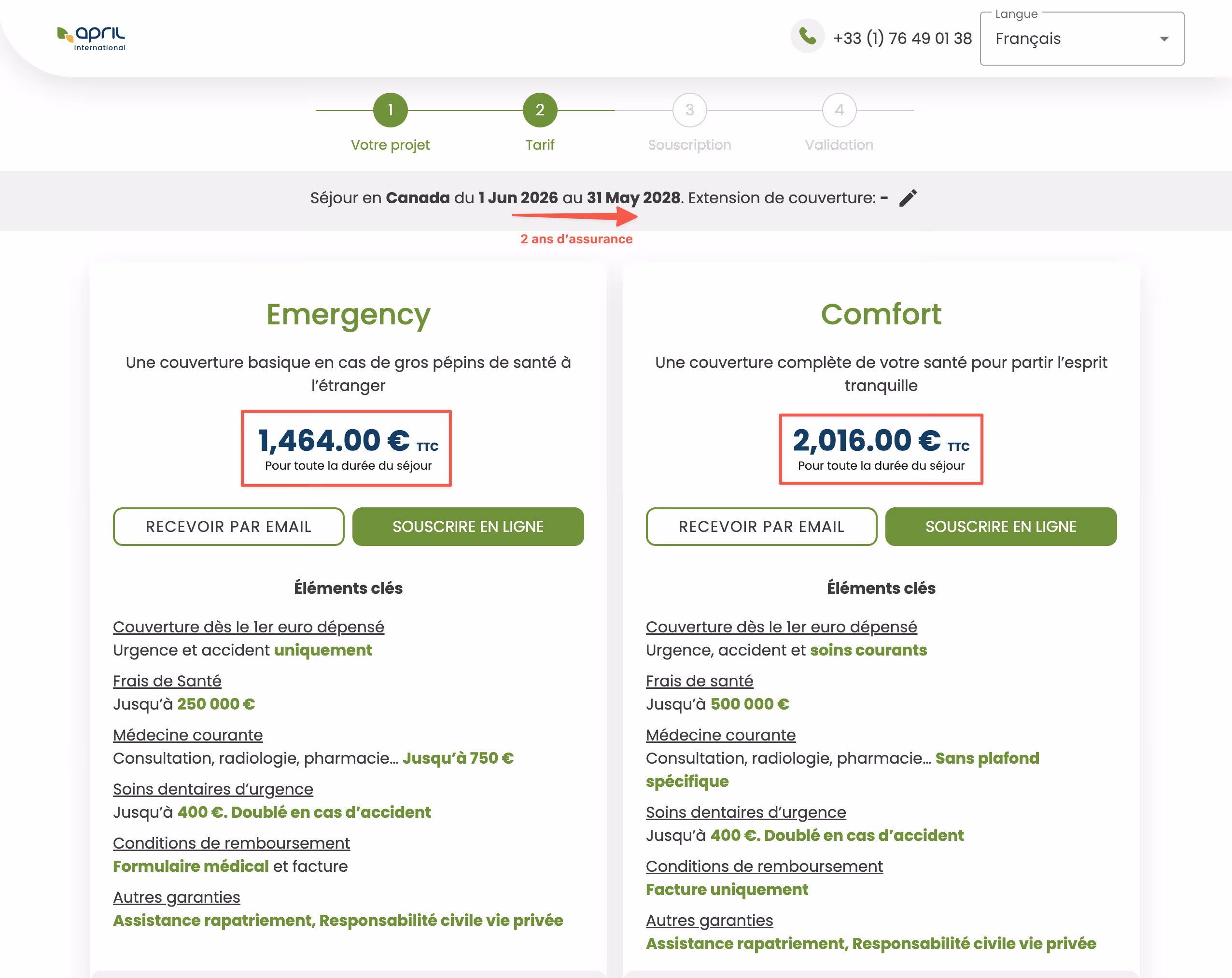 April propose 2 formules : Emergency (250 000€ de plafond) et Comfort (500 000€). La formule Emergency ne couvre que les accidents et urgences médicales, pas la médecine courante. Pour un PVT, c'est vraiment trop restrictif. Il faut obligatoirement prendre Comfort.