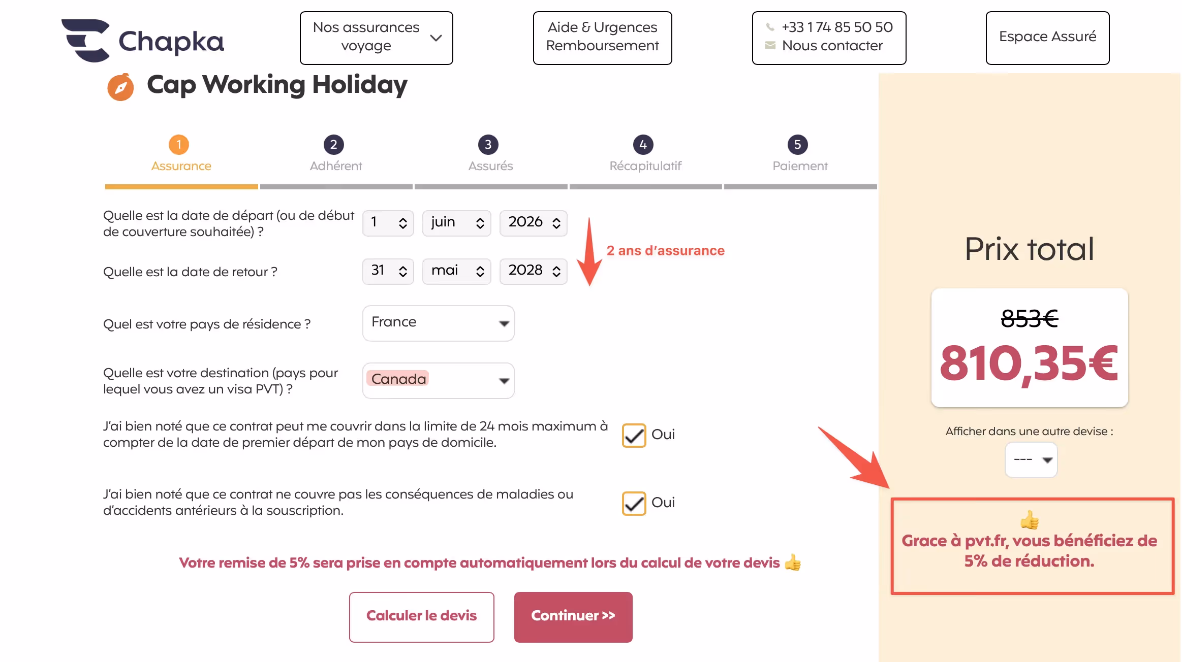 Mon expérience : Lors de mon arrivée au Canada en 2022 avec Chapka, l'agent d'immigration a bien vérifié mon attestation d'assurance et a ajusté la durée de mon PVT à 2 ans, comme indiqué sur mon contrat.
