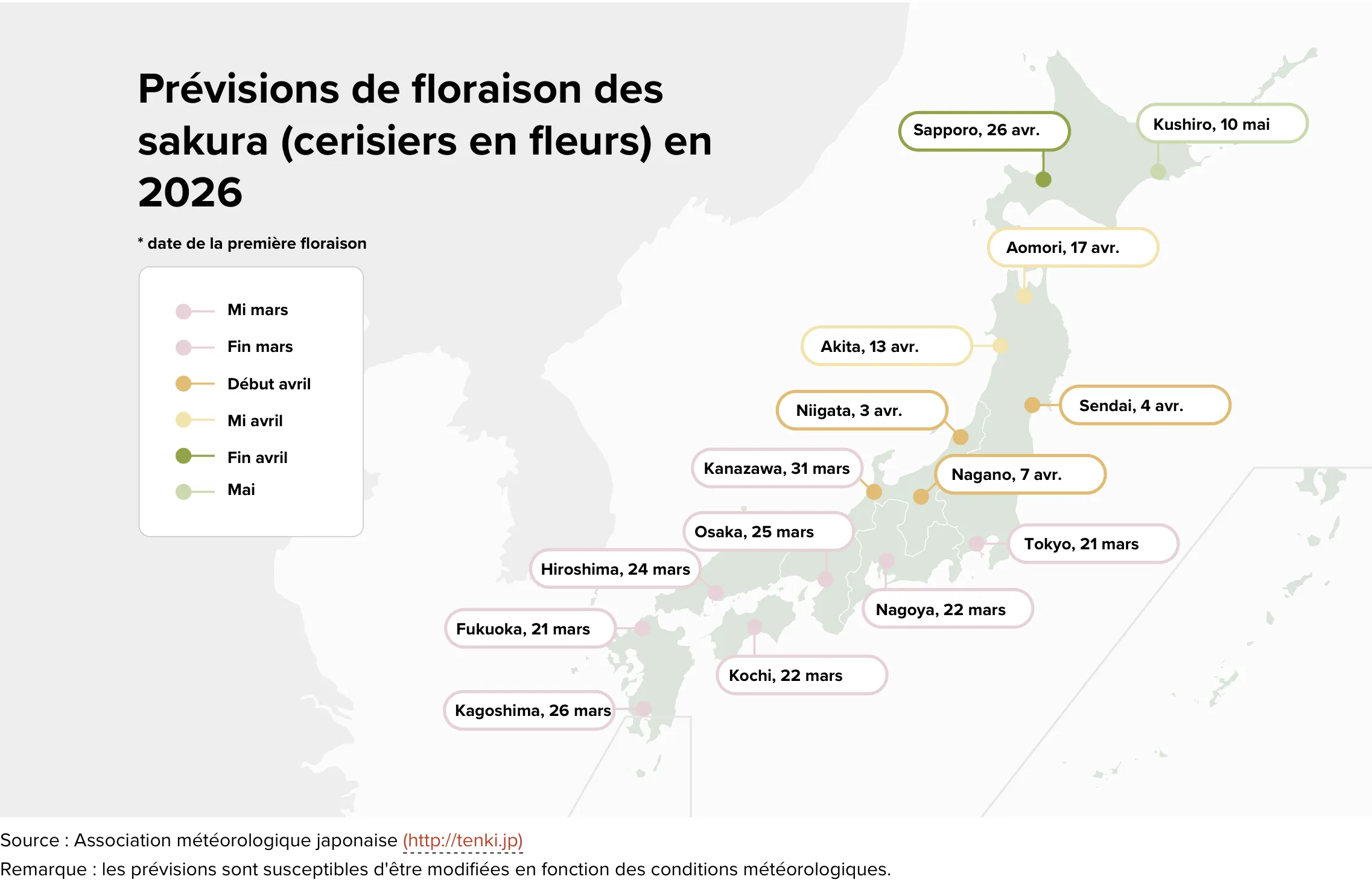 Dates prévisionnelles dans les grandes villes du Japon pour 2026