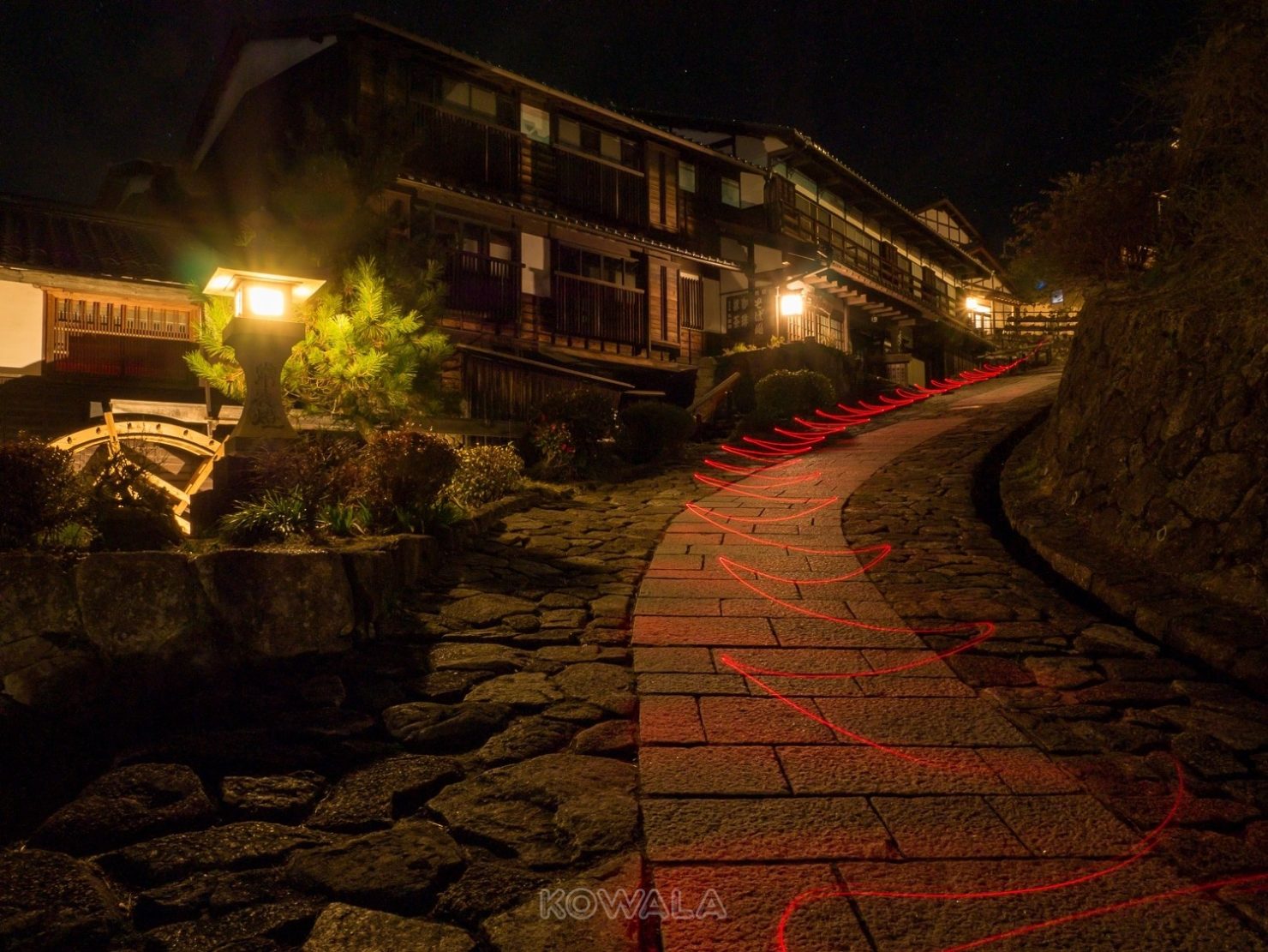 Après ce festin, je m’extirpe dans la rue de Magome pour une petite sortie nocturne. Le village est tout à moi, il n’y a plus un chat. L’occasion rêve de s’offrir une petite séance de lightpainting dans un décor assez mystique. On passera enfin notre première nuit dans une chambre à futon. Là encore, les craintes de gêne ou d’inconfort s’évanouissent immédiatement. Cette étape va définitivement nous rendre accrocs aux traditions japonaises !