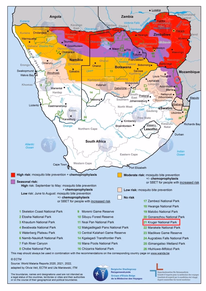 Le risque de contracter le paludisme est très faible en Afrique du Sud, hormis si vous prévoyez de visiter la région nord-est dont le fameux parc national Kruger où le traitement devient recommandé, surtout pour la période de septembre à mai (période de risque élevé).
